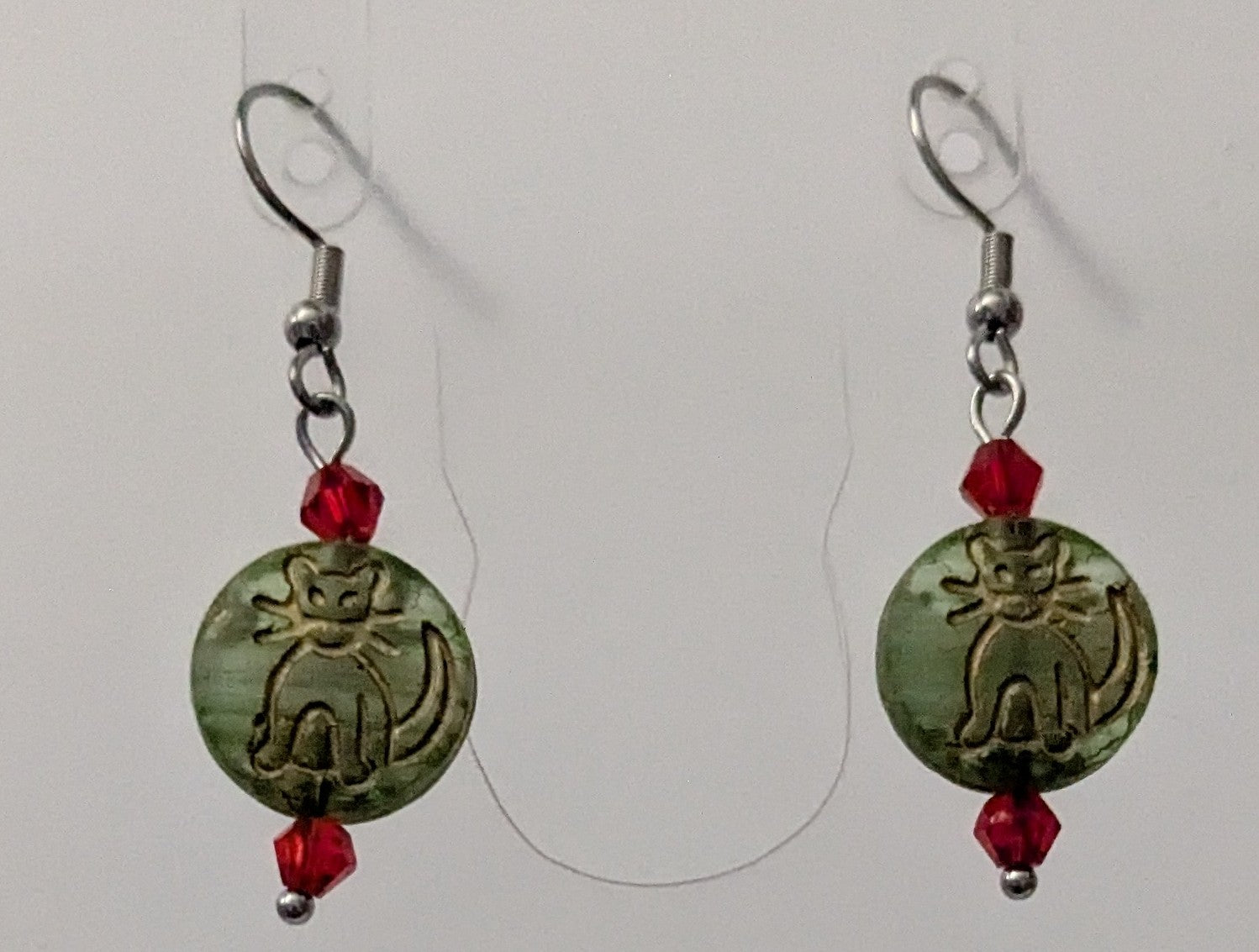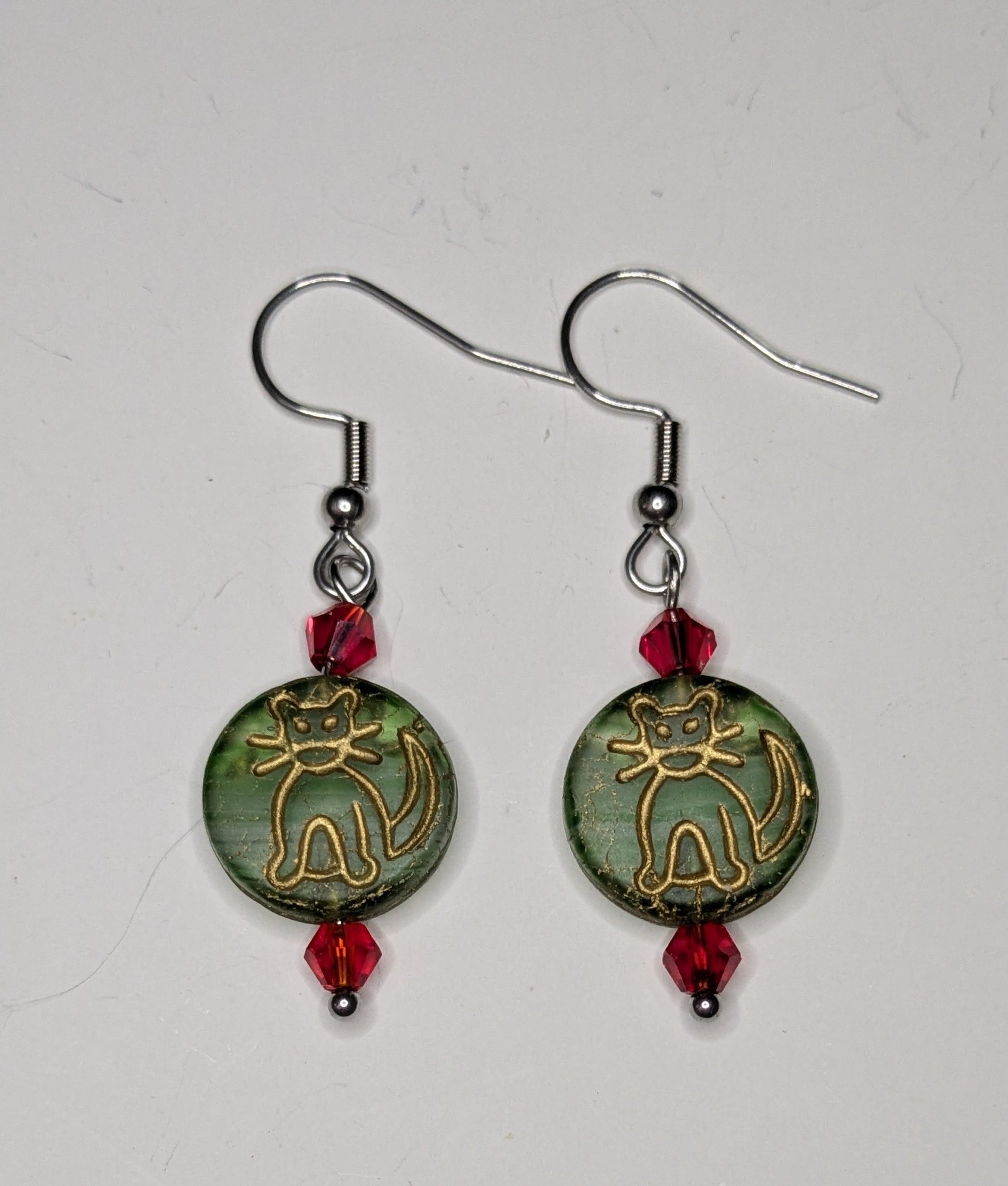 Kiitties etched into Czech green glass beads with a gold wash accented with red faceted bi cone beads. Stainless steel hook ear wires.